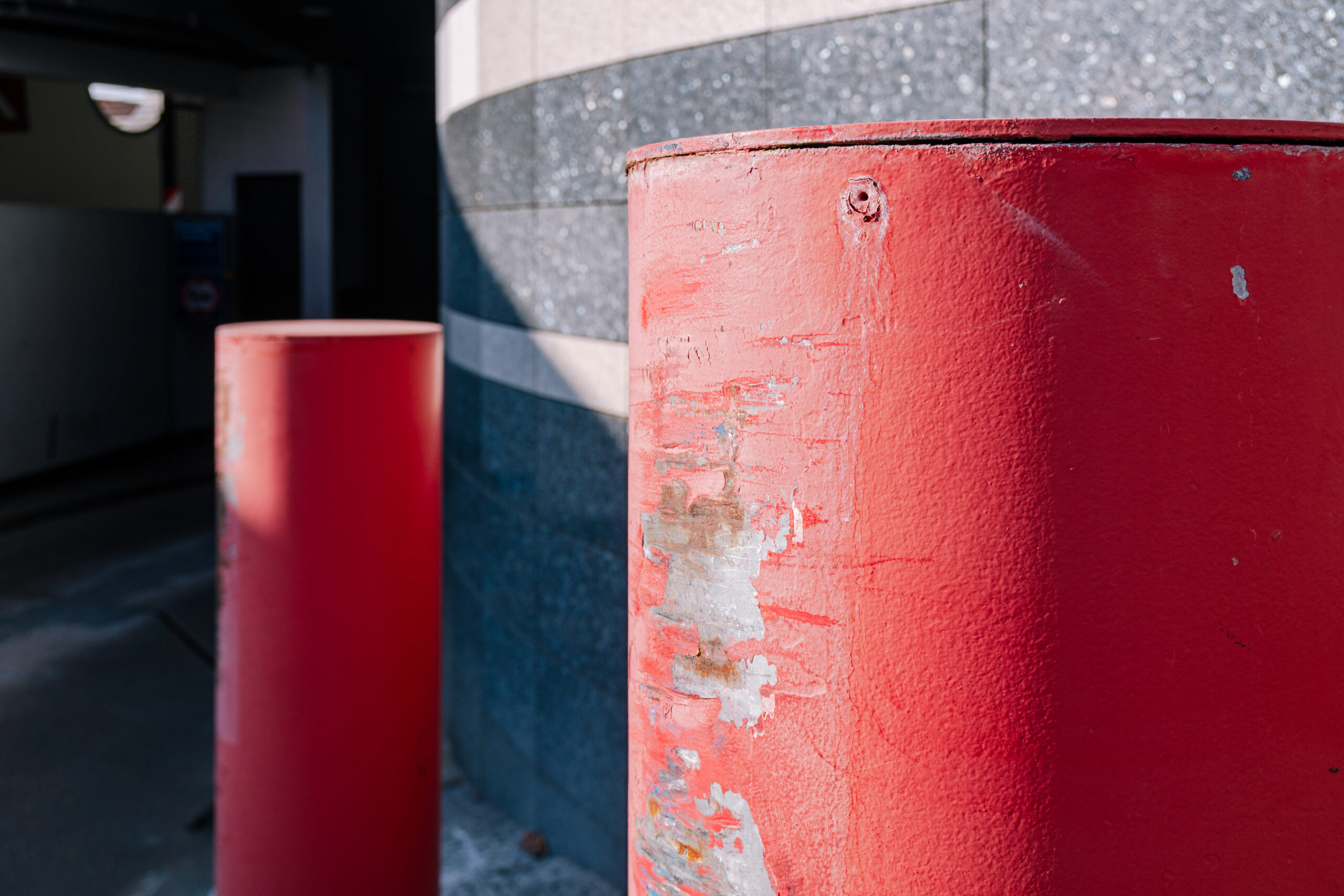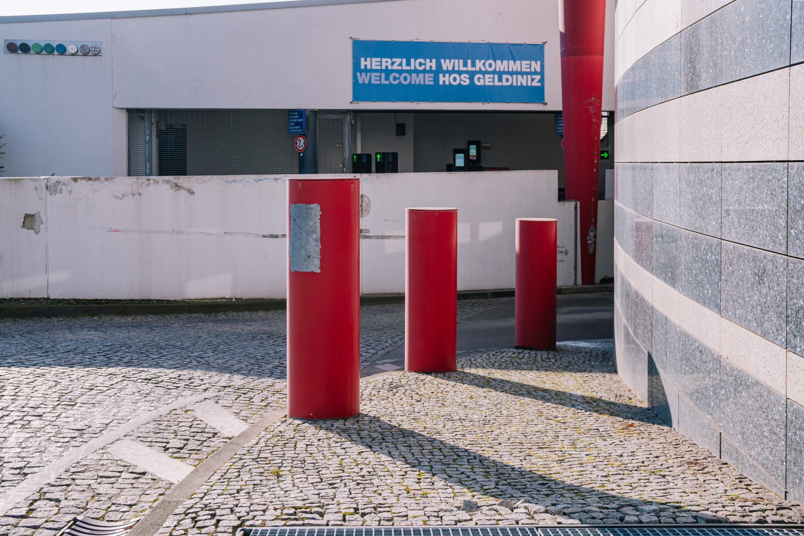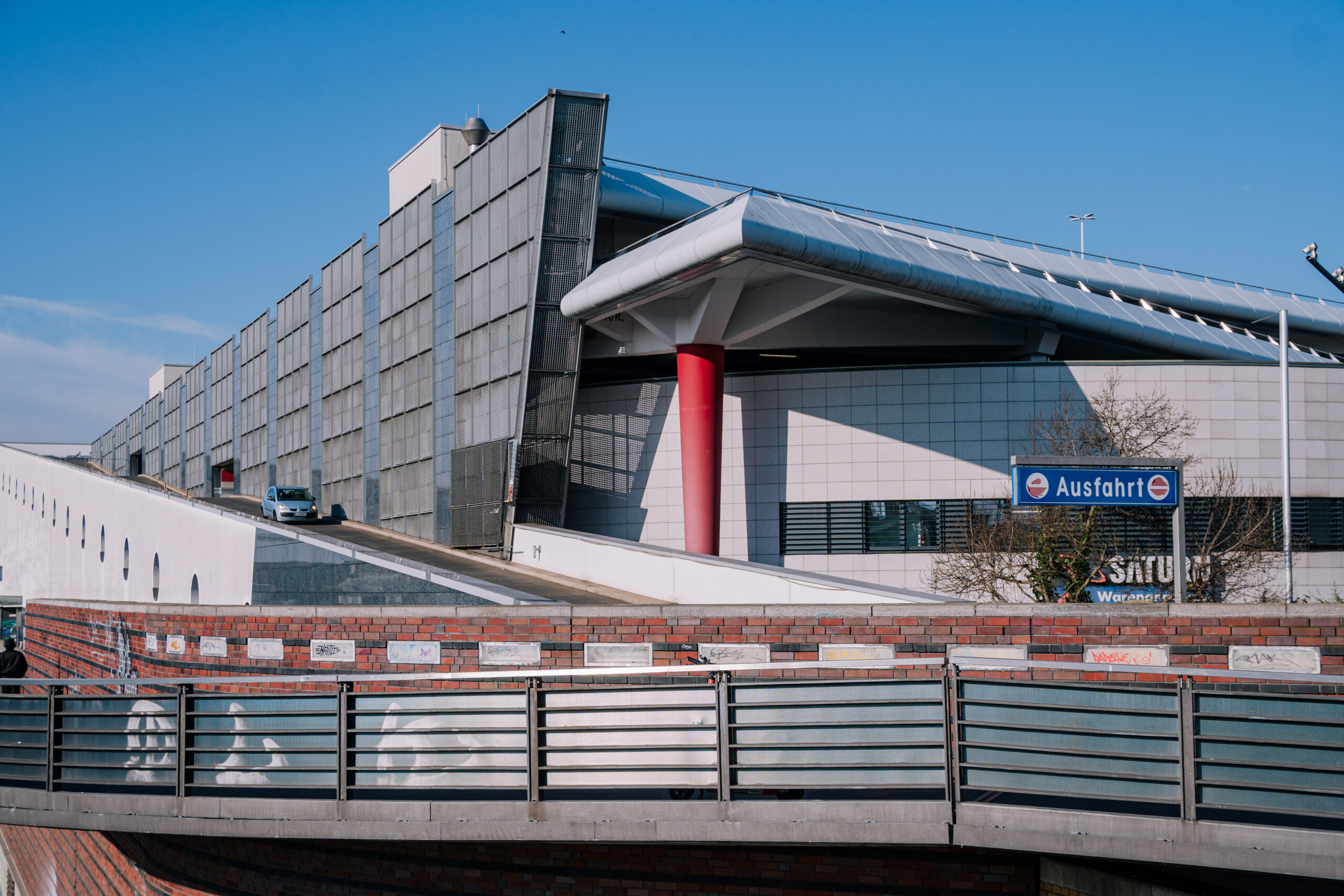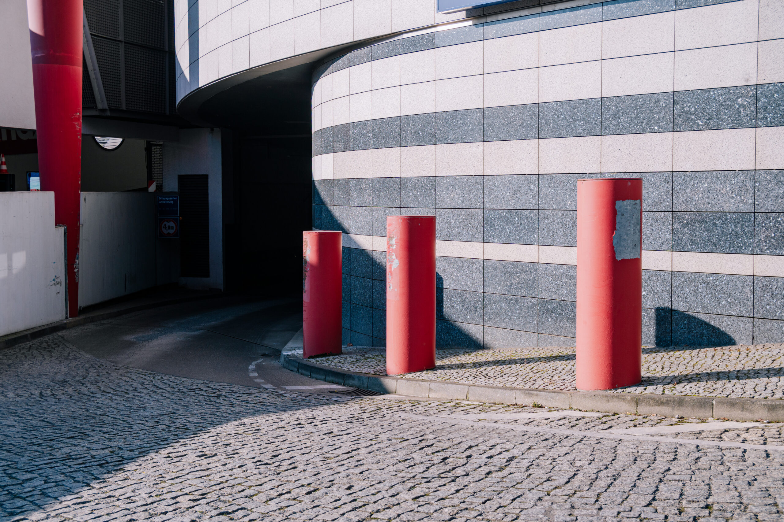 Entrance to the underground parking of a shopping center, where leading lines create a sense of depth. The black-and-white color scheme with red accents highlights the great geometry. Be sure to check the opening hours.